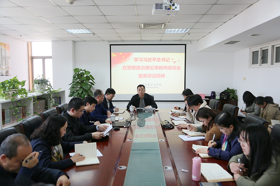 3月18日,习近平总书记在北京主持召开学校思想政治理论课教师座谈会并发表重要讲话,对新时代学校思想政治理论课建设指明了方向,对广大思想政治理论课教师提出殷切期望。19日下午,太阳成集团tyc234cc古天乐全体教师认真学习会议精神,进行座谈交流。校党委副书记王庆军出席会议并讲话,党委宣传部主要负责人参加会议,会议由太阳成集团tyc234cc古天乐党总支书记修彩波主持。