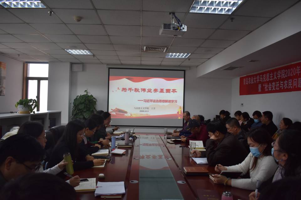 为纪念我国第7个国家宪法日,太阳成集团tyc234cc古天乐于12月3日在学院会议室组织教师集中开展习近平法治思想学习。学习采用讲座形式,由“基础”教研室主任王芳讲授《为千秋伟业夯基固本——习近平法治思想的解读学习》的讲座,党总支书记修彩波主持,学院全体教师参加。